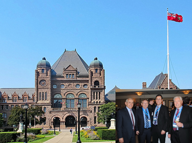 Ontario Water Power Association’s Reception at the Ontario Legislative Building – March 26, 2014. The event allowed representatives of the industry to meet with Ontario MPPs and Ministers to discuss the benefits of waterpower for the Ontario economy. The insertion includes from left to right: Hon. Bob Chiarelli, Minister of Energy; Hon. Jim Bradley, Minister of the Environment; Frank Perri, General Manager, St. CatharinesHydro; and Ion Corbu, Corbu Consulting.